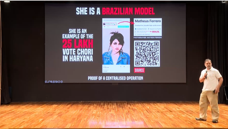 Gandhi showed the press voter list entries with the woman’s picture under names like Saraswati, Seema, and Sweety. The image was freely available for download from stock photography websites, according to an independent investigation.